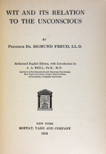 FIRST AMERICAN EDITION. Moffat, Yard and Company, New York, 1916. Hardcover, [i-iv] v-vii [viii-x] [1-2] 3-388 pp. No dust jacket. First Edition in English of Der Witz und seine Beziehung zum Unbewussten (1905). Authorized English Edition, with Introduction by A. A. Brill. A couple of notes on side margins in the text, small paper cut on page vii. Some spine discoloration and minor soiling to covers. Light wear along edges. Spine tonned. Missing small chip from the spine top edge. Binding is tight. Overall very good, collectible copy. With the Interpretation of Dreams and Psychopathology of Everyday Life, Professor Freud has definitely bridged the gulf between normal and abnormal mental states by demonstrating that dreams and faulty acts like some forms of forgetting, slips of the tongue, slips of reading, writing, etc., are closely allied to psychopathological states and represent the prototypes of such abnormal mental conditions as neurotic symptoms, hallucinations, and deliria. He also shows that all these productions are senseful and purposive, and that their strange and peculiar appearance is due to distortions produced by various psychic processes. These views are confirmed in the present volume, where it is demonstrated that wit, which belongs to æsthetics, is subject to the same laws, shows the same mechanism, and serves the same tendencies as the other psychic productions. With his wonted profundity and ingenuity the author adds the solution of wit to those of the neuroses, dreams, and psychopathological acts.